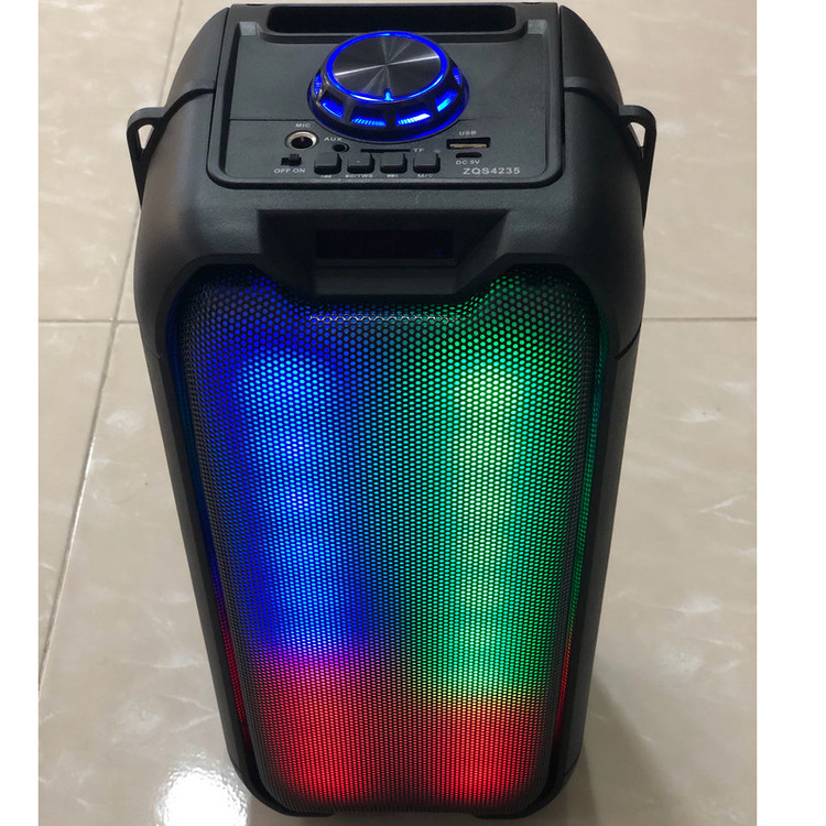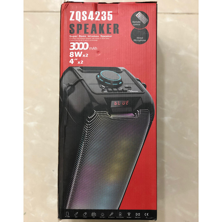 اسپیکر چمدانی بی سیم و قابل حمل مدل ZQS-4235به همراه میکروفن وایرلس و ریموت کنترل میباشد ابعاد اسپیکر 40x20x20سانتیمتر -بدنه محکم از مواد مرغوب ساخته شده است که مقاومت بالایی در برابر آسیب هایی نظیر ضربه و فشار از خود نشان میدهد این اسپیکر از کیفیت پخش صدای قدرتمندی برای جشن ها و مهمانی ها به خصوص در محیط باز و شلوغ برخوردار میباشد -درایو قدرتمند 2 تا 4اینچی این پارت باکس با توان خروجی معادل 3000 وات همچنان دارای نور پردازی داخلی در هنگام پخش موسیقی میباشد نمایشگر LED وپنلی از دکمه های فیزیکی جهت مدیریت موسیقی ؛ تنظیم ولوم ونور…. بر روی بدنه تعبیه شده ویک ریموت کنترل نیز همراه آن قرار دارد تا از راه دور این تنظیمات نیز برای کاربر امکان پذیر باشد- شارژ مجدد باتری نیز به وسیله آداپتور مخصوص قابل انجام میباشد ورودی شامل USB-AUX-BLUETOOTHمیباشد.